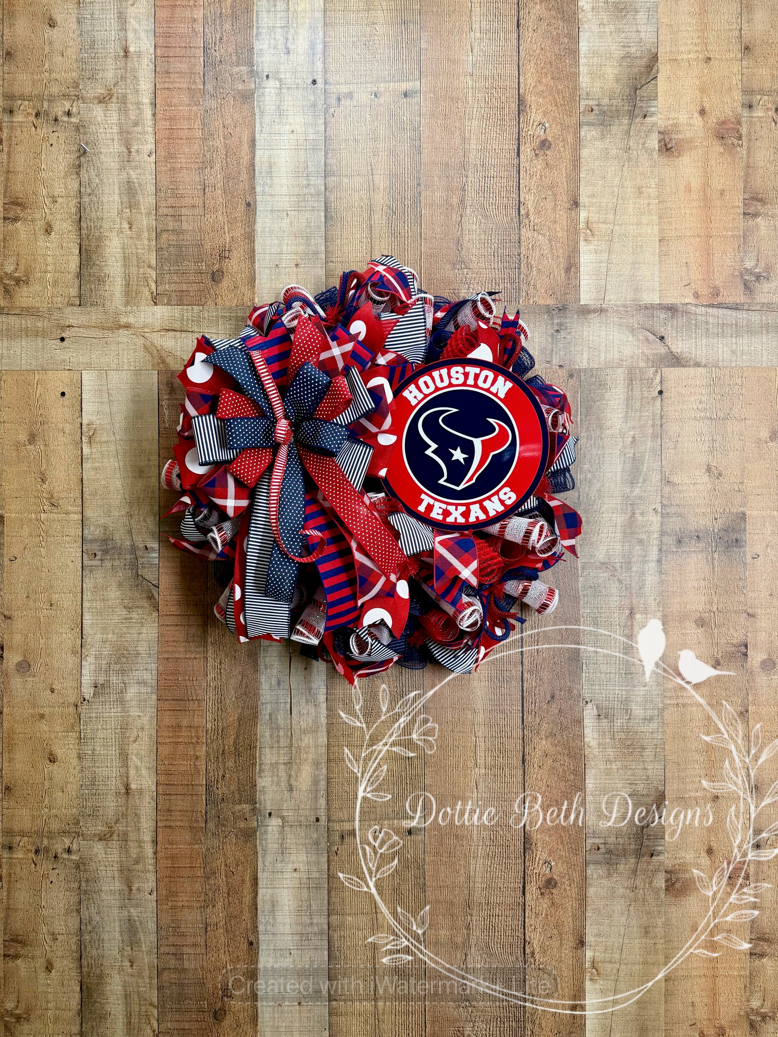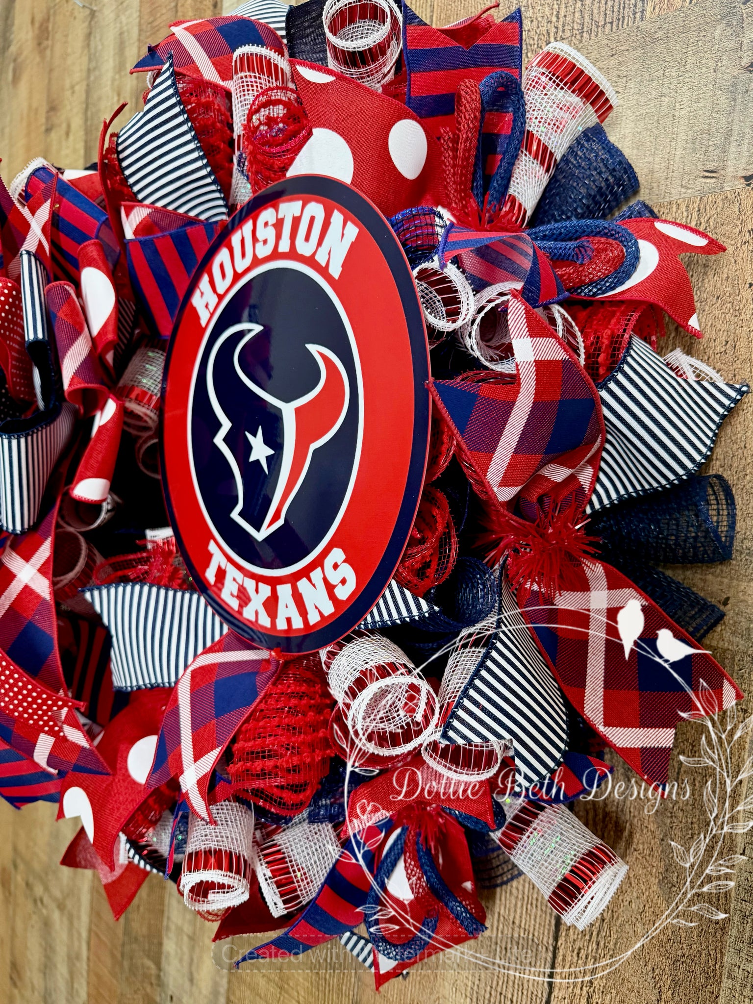 Show your Houston pride with this bold and full Houston Texans wreath, designed in classic red, navy, and white. This football-themed deco mesh wreath features layered ribbons including stripes, polka dots, and plaid for rich texture and visual interest, all centered around a Houston Texans sign that makes a strong statement on any front door.