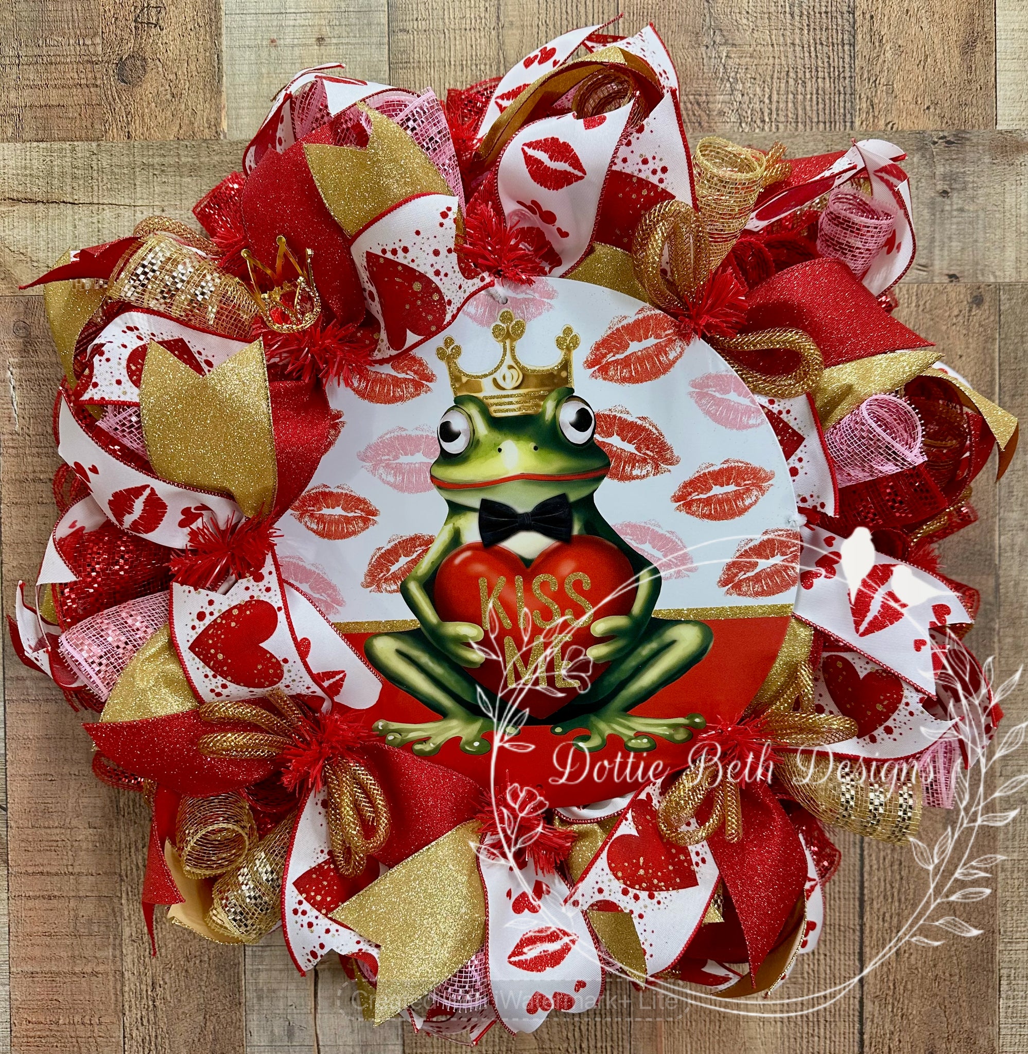This Kiss Me Frog Valentine wreath is full of charm, personality, and playful romance. Featuring a crowned frog holding a heart with “Kiss Me” lettering, this design is layered with bold red, gold, and white ribbons accented with hearts, kisses, and shimmering textures. The mix of glittery ribbon, fun prints, and whimsical details makes this wreath a standout piece for Valentine’s Day