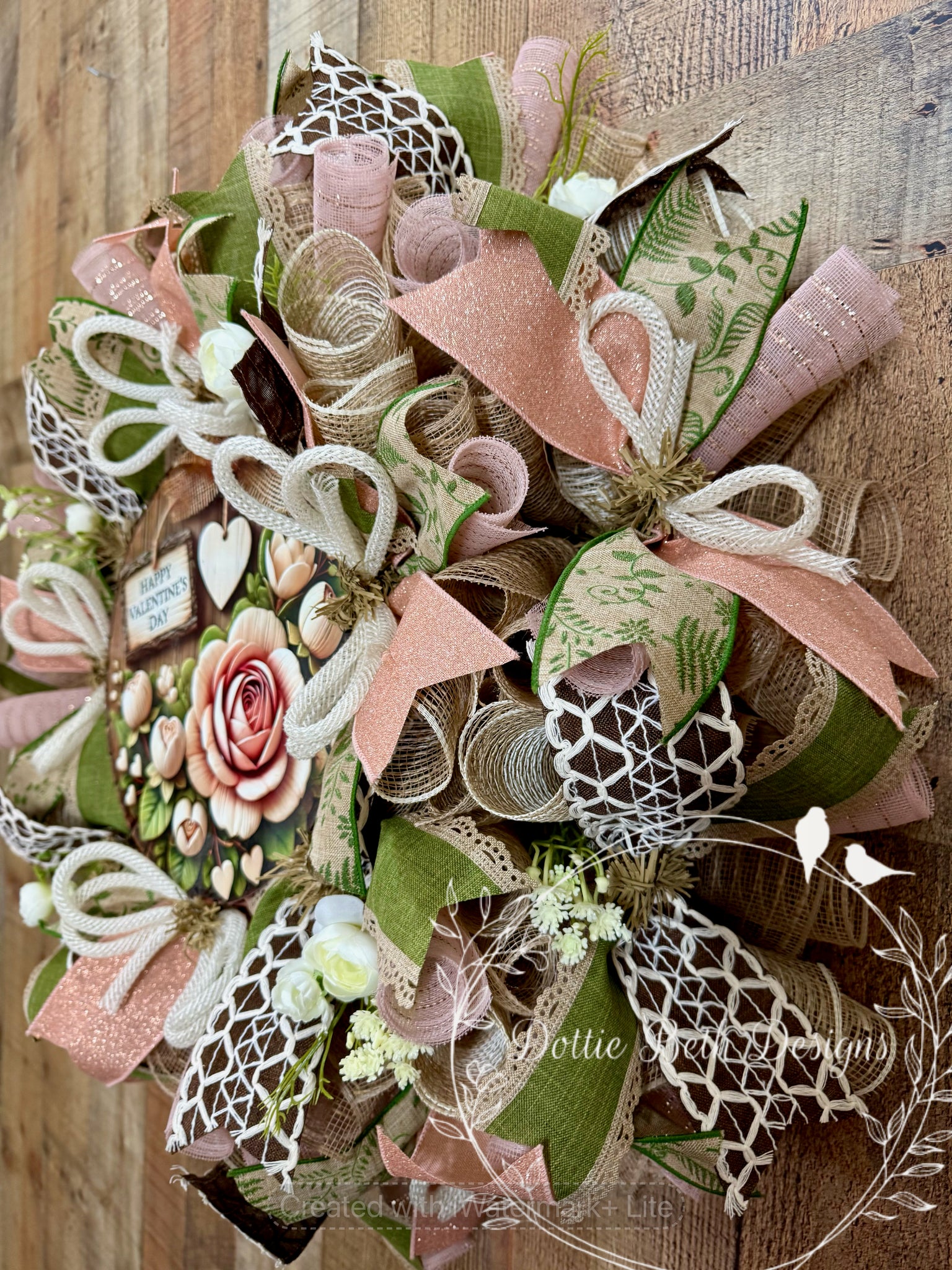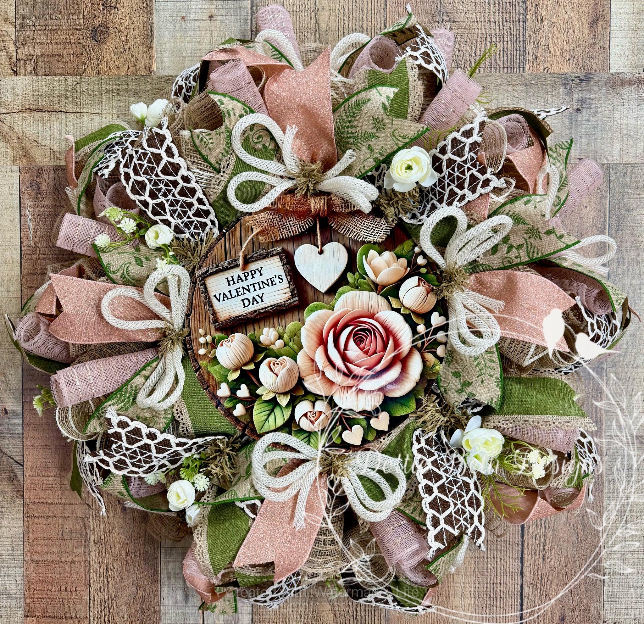 Celebrate love with this romantic Valentine’s Day wreath featuring soft pinks, natural greenery, and rustic farmhouse charm. This design showcases layered mesh and ribbon textures, delicate florals, and a beautifully detailed floral centerpiece with a “Happy Valentine’s Day” sign for a warm, inviting focal point.