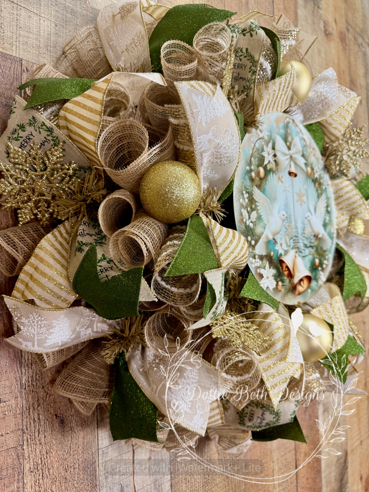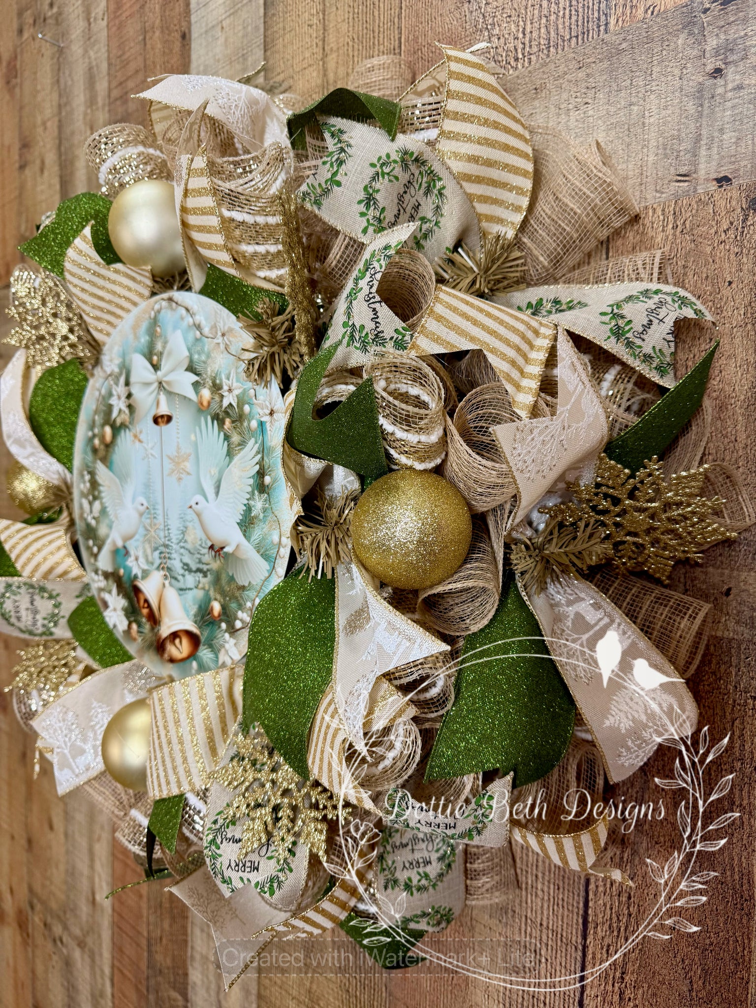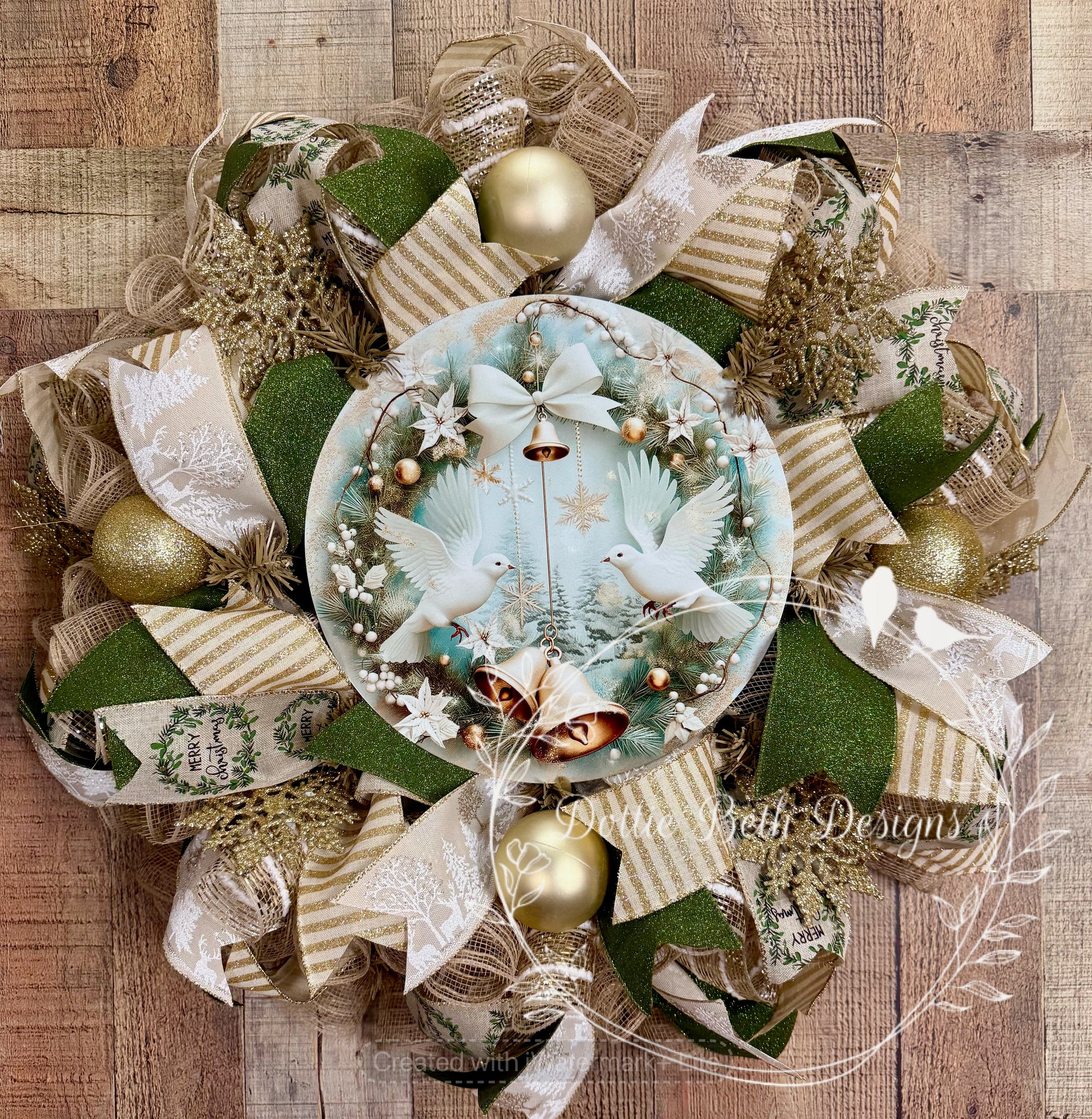 Graceful white doves and shimmering gold accents make this wreath a breathtaking choice for your holiday décor. Soft ivory and gold ribbons with hints of green create a luxurious, elegant design. Glittered ornaments and snowflake details add a subtle sparkle, while the dove and bell centerpiece brings a message of peace and joy to your home this season. Approx 25” in diameter