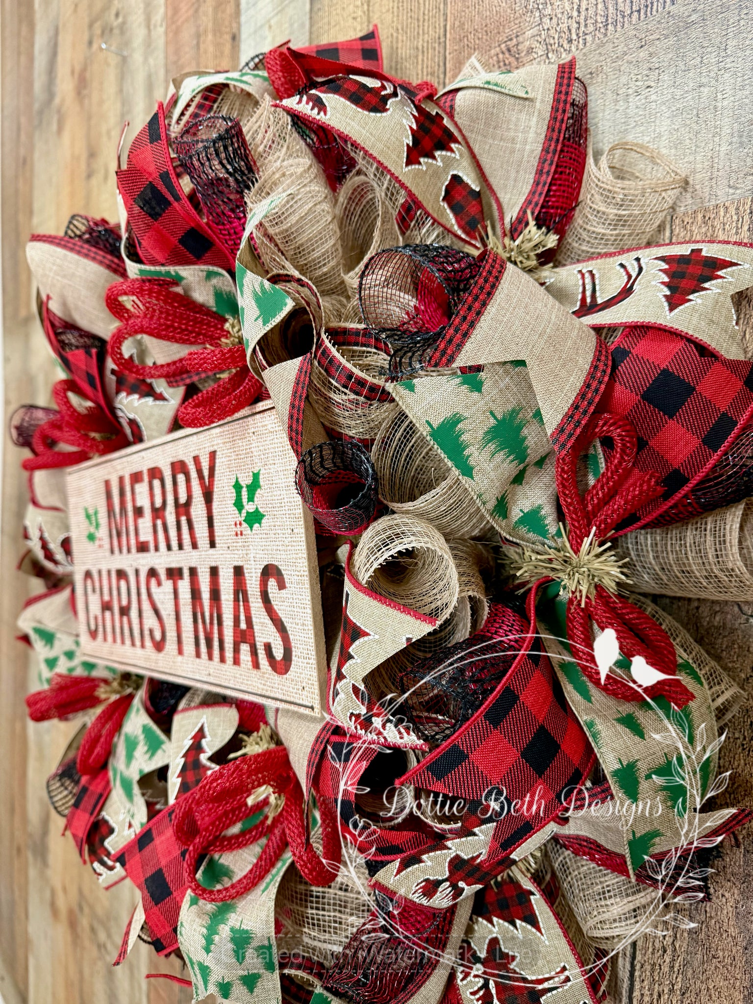 This Merry Christmas buffalo plaid wreath is the perfect mix of cozy and festive. Designed with a rustic holiday sign at the center, it’s surrounded by layers of classic red and black plaid ribbon, green Christmas tree accents, and cheerful red details. The warm farmhouse style makes it a beautiful addition to your front porch or holiday entryway. A charming piece that captures the heart of Christmas in a welcoming, down-to-earth way. Approximately 25 inches in diameter. Best displayed under a covered area to maintain its vibrant look.