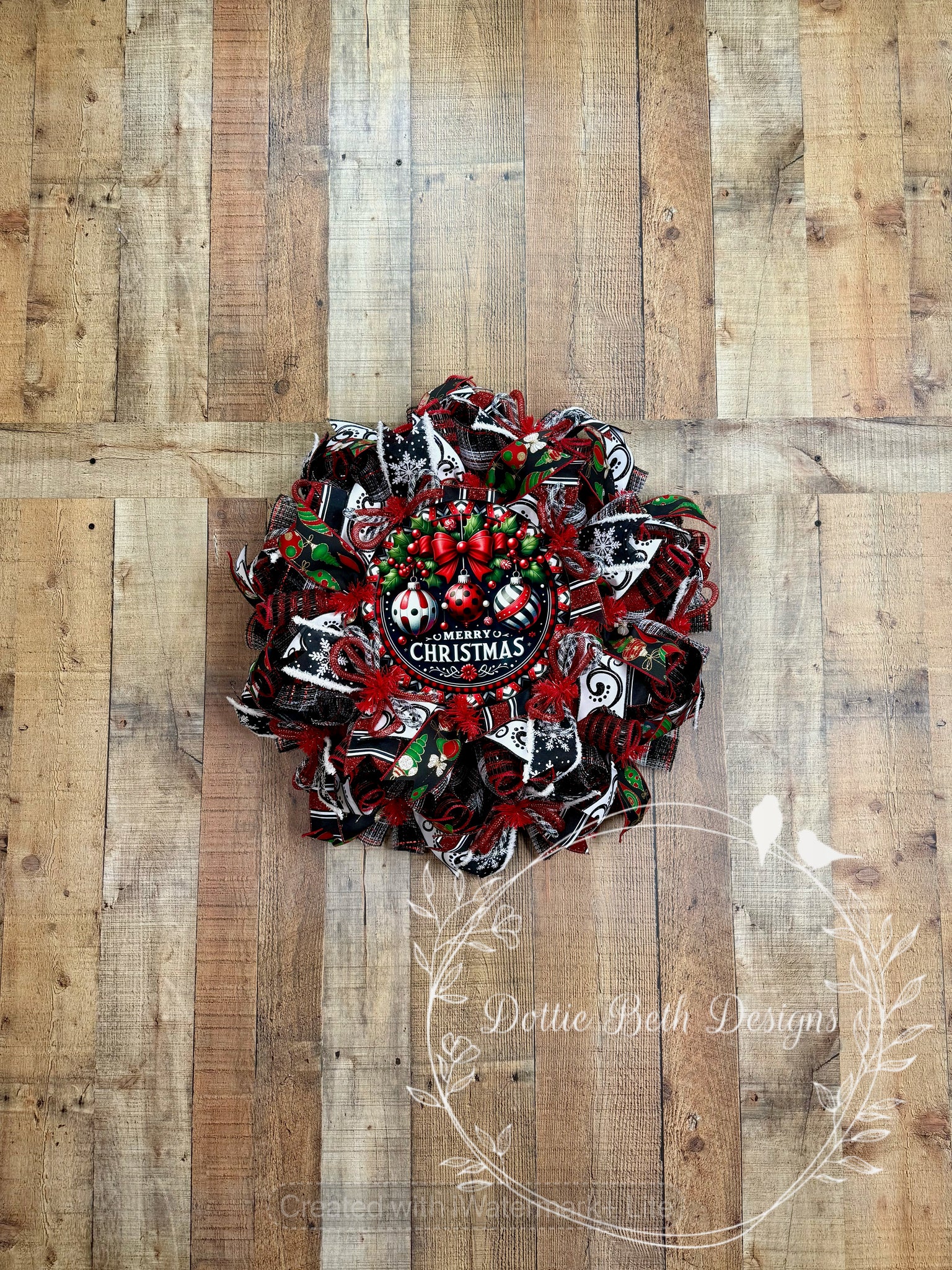 Bold and festive, this red, black, and white Christmas wreath makes a striking holiday statement. The centerpiece features bright Christmas ornaments with a Merry Christmas message, framed by layers of elegant ribbon in plaid, swirls, holly, and snowflake designs. This wreath is a wonderful way to showcase your holiday spirit in a modern yet classic color palette. Hang it on your front door, inside above a fireplace, or in your entryway to wow your guests all season long. Approximately 25 inches in diameter. Best displayed under a covered area for maximum longevity.