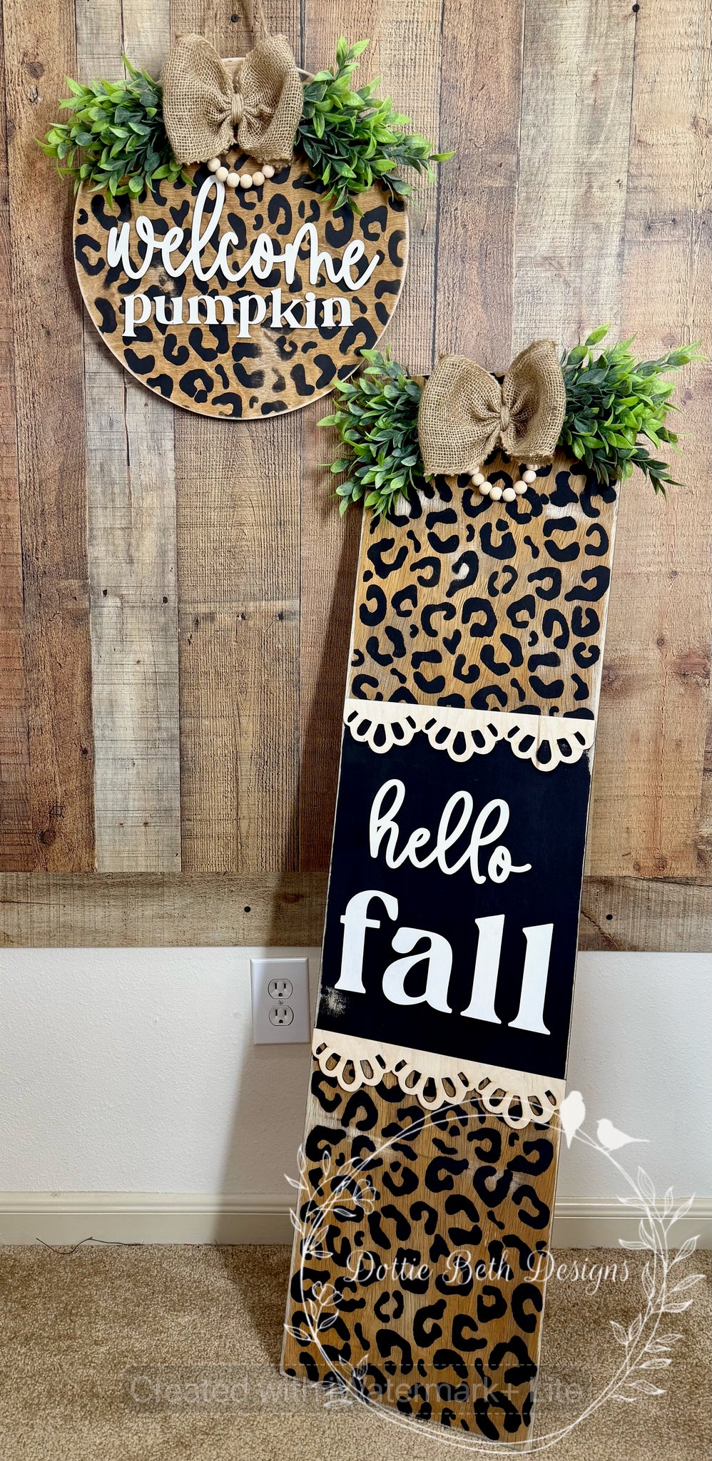 Make a bold statement this fall with this matching set of leopard print porch signs. The tall “Hello Fall” vertical porch sign pairs perfectly with the round “Welcome Pumpkin” door hanger, both featuring hand-painted leopard patterns, greenery, and burlap bows. Crafted from solid wood and finished with paint—never vinyl. Perfect for farmhouse, rustic, or modern fall décor.