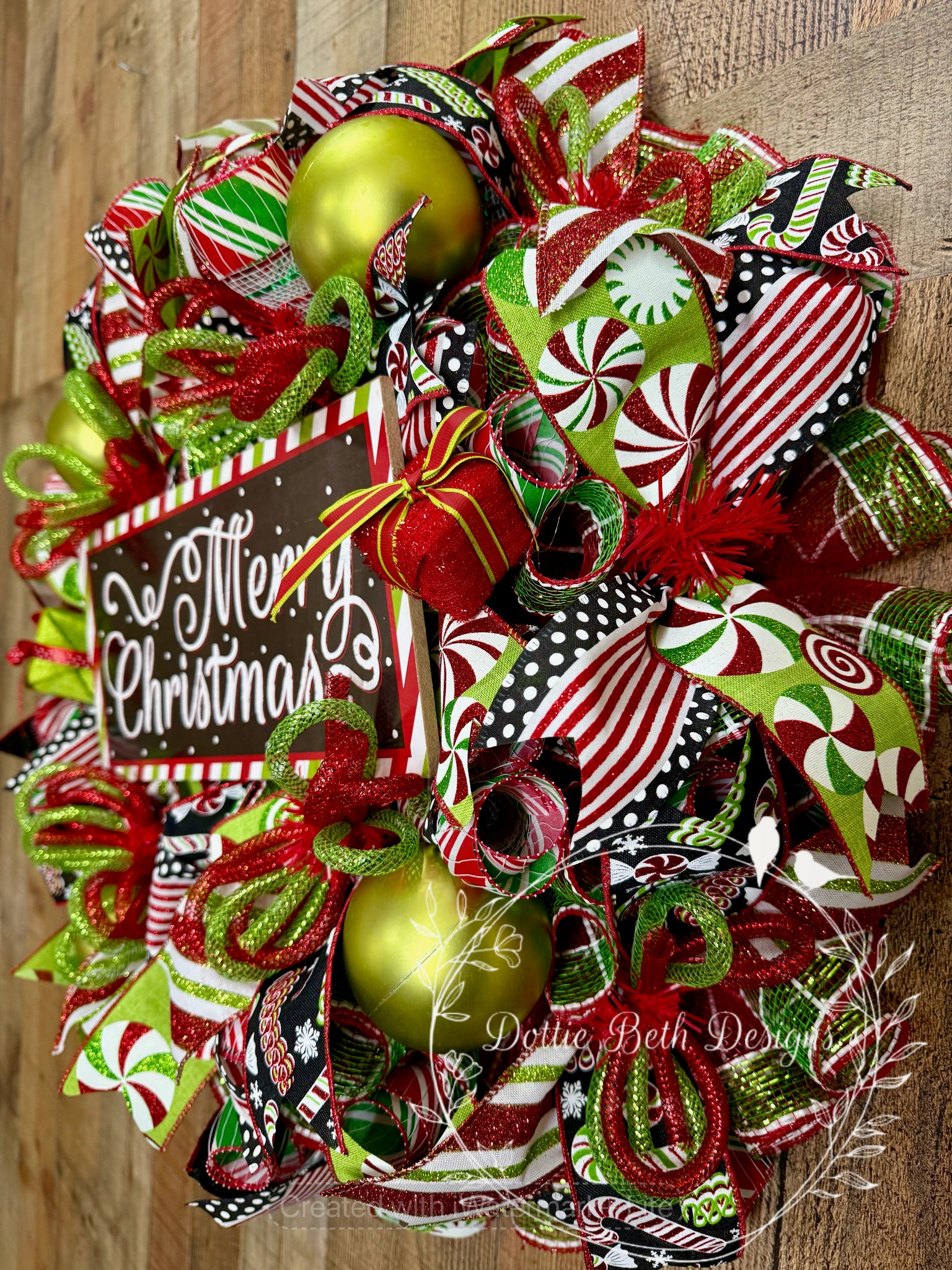 This bold and cheerful Christmas wreath bursts with candy-striped ribbons, sparkling ornaments, and a festive “Merry Christmas” sign that captures the joy of the season. The playful mix of red, green, black, and white patterns adds a modern twist to traditional holiday décor. Perfect for front doors, entryways, or mantels, this wreath spreads instant holiday cheer wherever it’s displayed. Approx. 25” in diameter.
