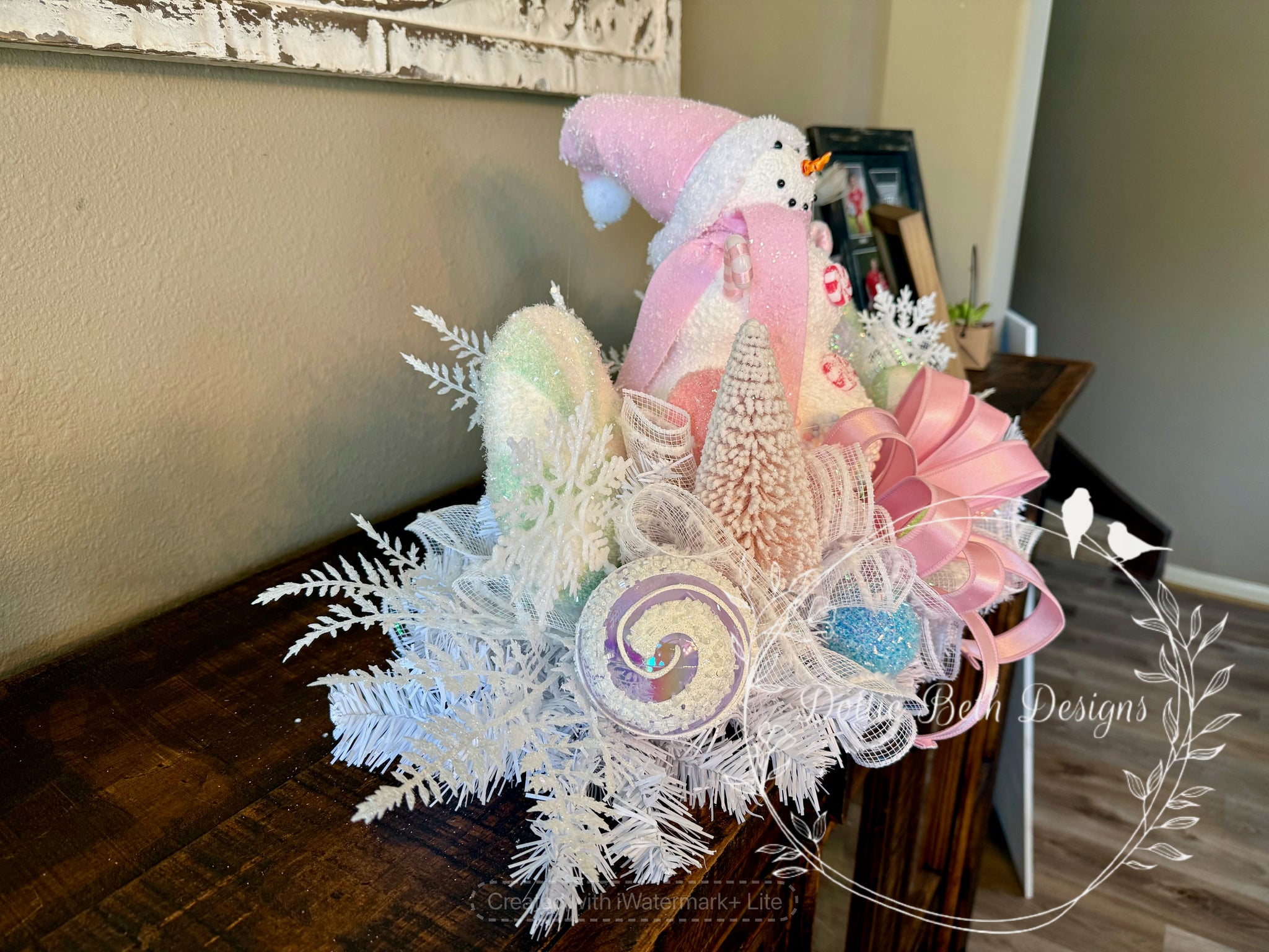 Add a sprinkle of sweetness to your holiday décor with this pastel snowman candyland centerpiece. Measuring approximately 26 inches long, it features a cheerful snowman surrounded by glittered candy accents, frosted ornaments, pastel bottlebrush trees, and shimmering snowflakes. A pink satin bow and sparkling candy embellishment bring it all together for a festive, whimsical look.