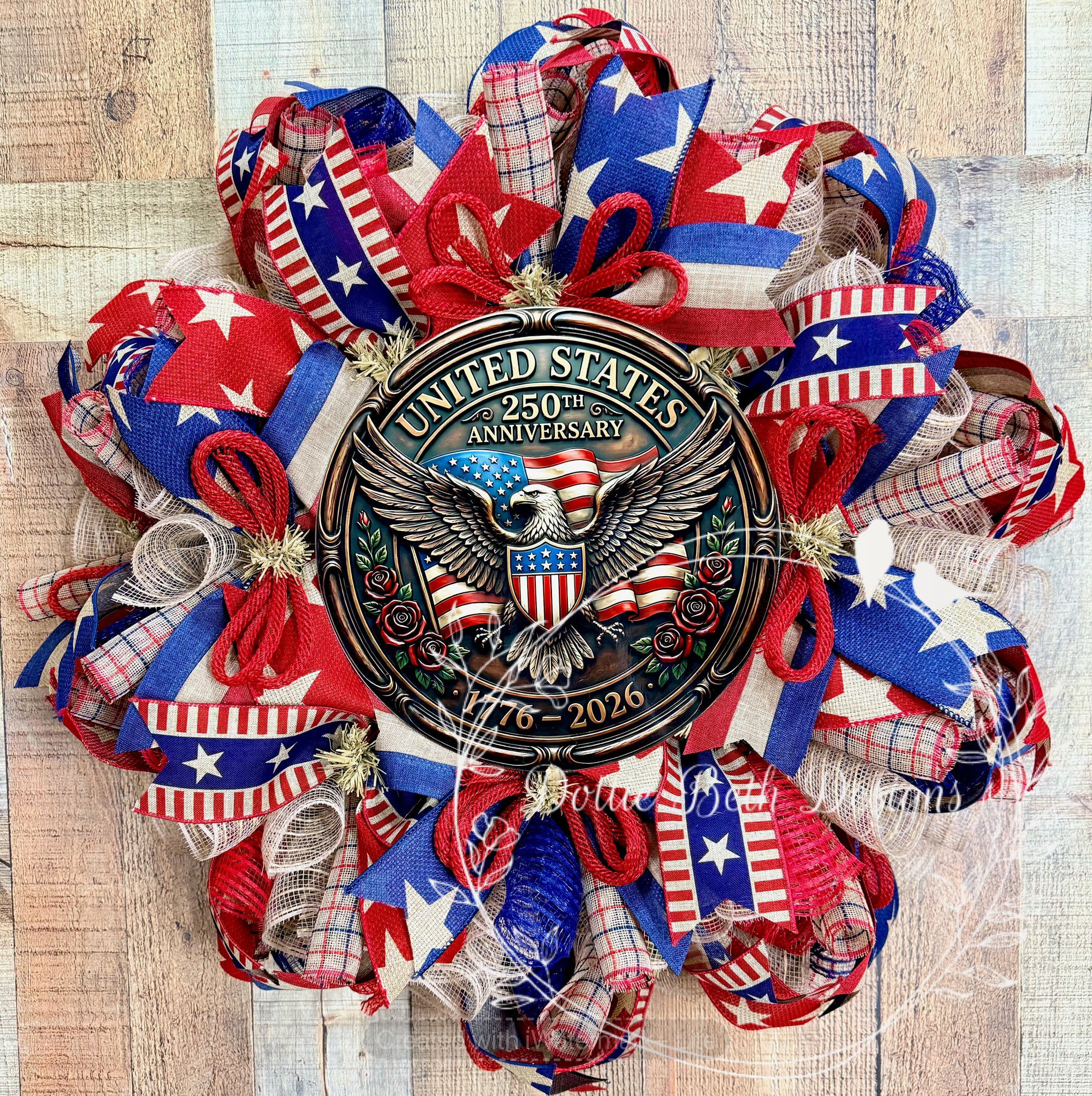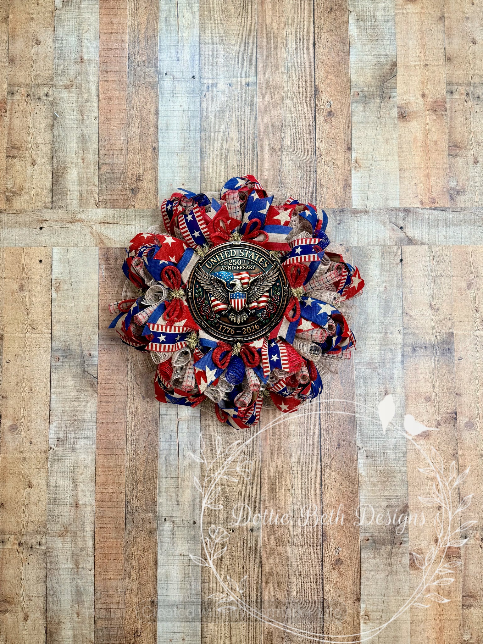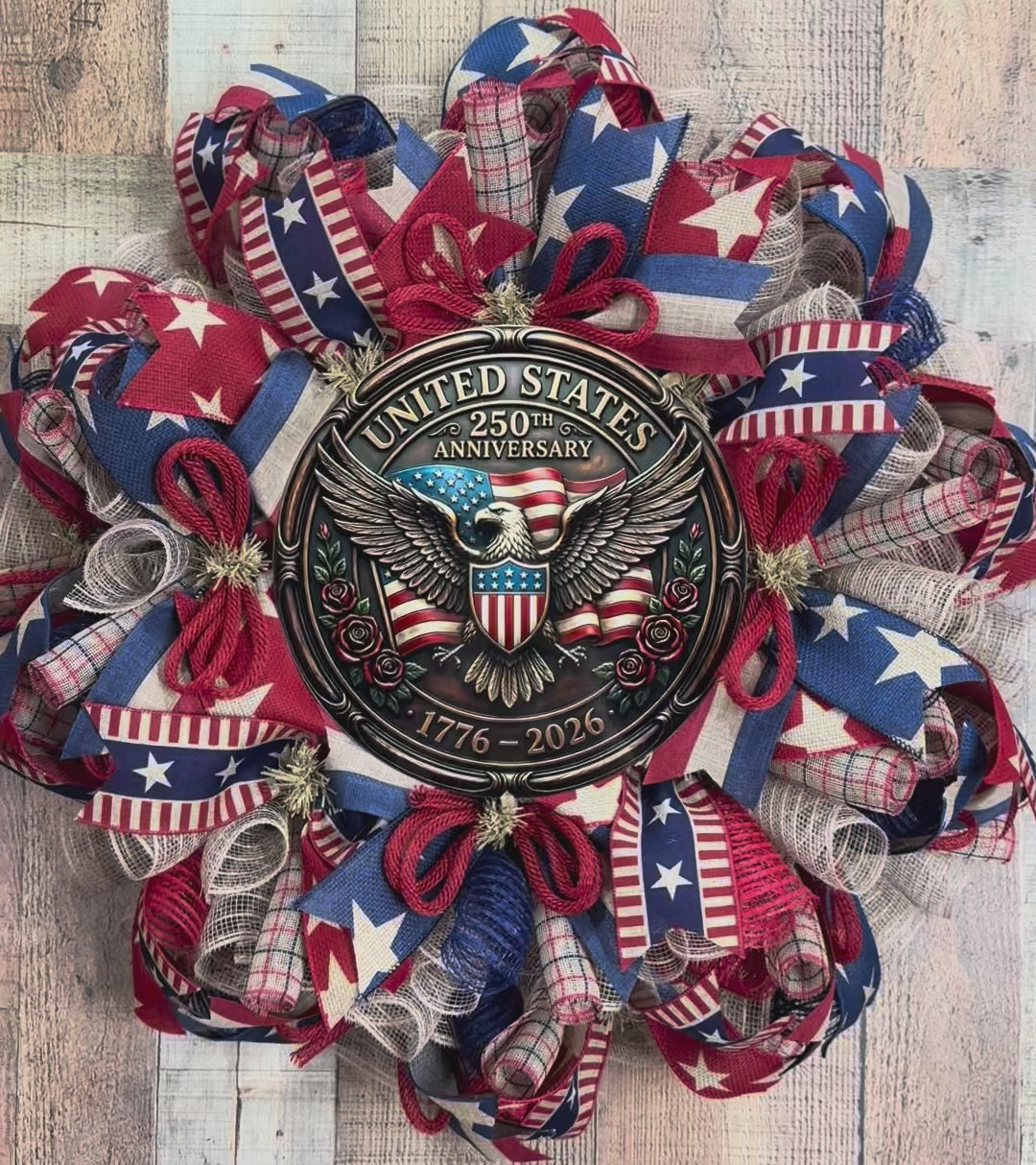 Celebrate America’s historic milestone with this bold United States 250th Anniversary patriotic wreath. Designed to honor the nation’s Semiquincentennial, this striking wreath features a detailed American eagle emblem with the dates 1776–2026, symbolizing 250 years of American independence.