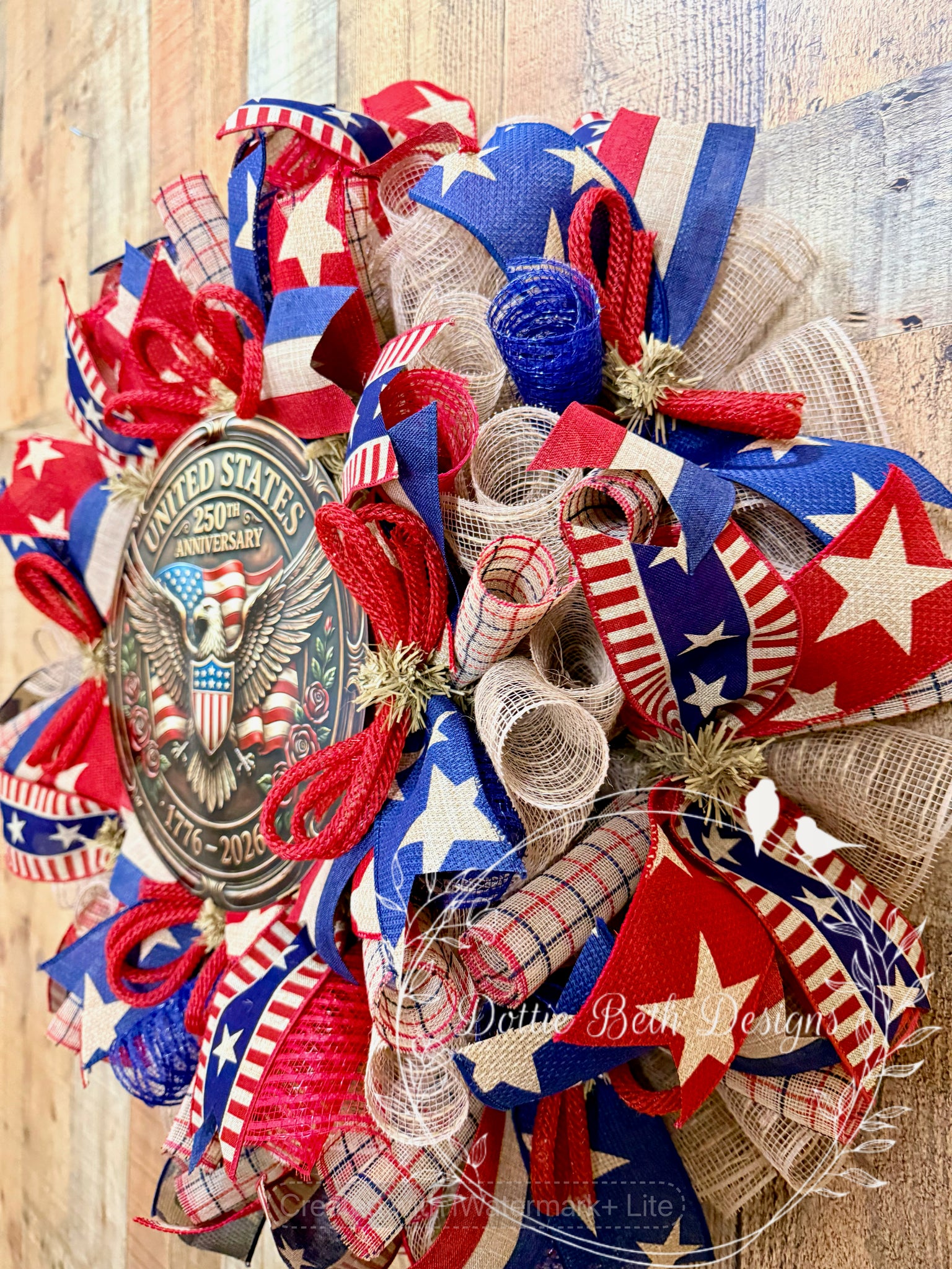 Layers of premium red, white, and blue deco mesh create a full, vibrant base that makes this wreath stand out beautifully on any front door. A variety of high-quality wired ribbons featuring stars, stripes, and classic patriotic patterns are carefully arranged throughout the wreath, adding depth, texture, and movement. The dramatic bow and bold colors make this the perfect statement piece for celebrating America’s 250th birthday.
