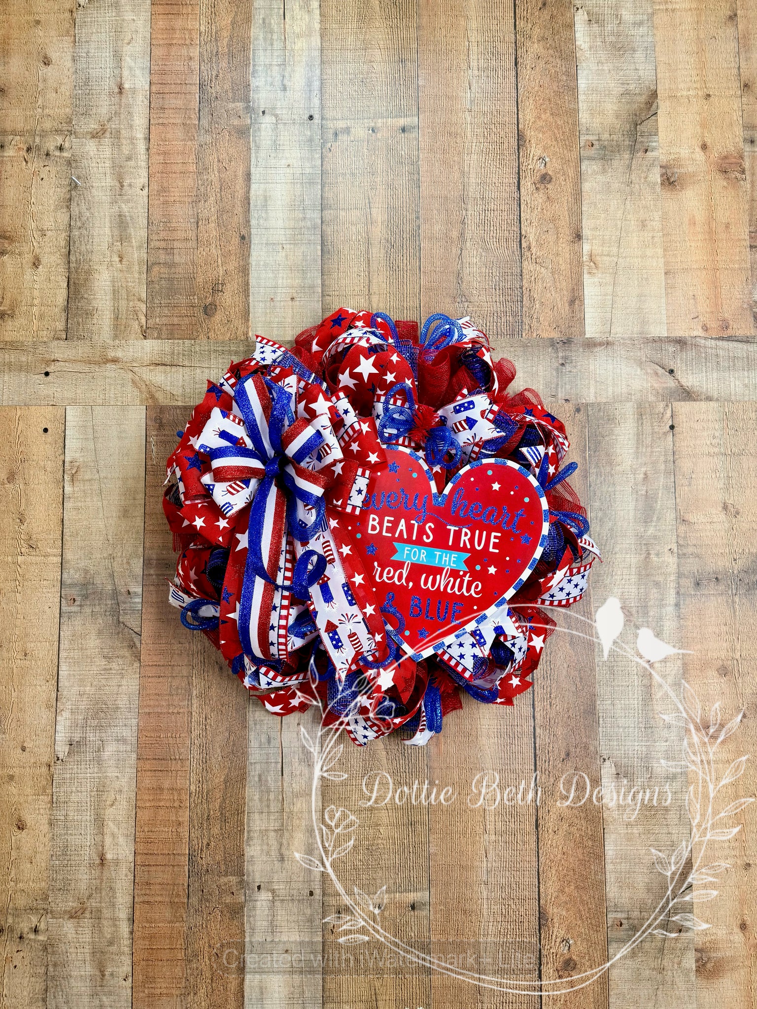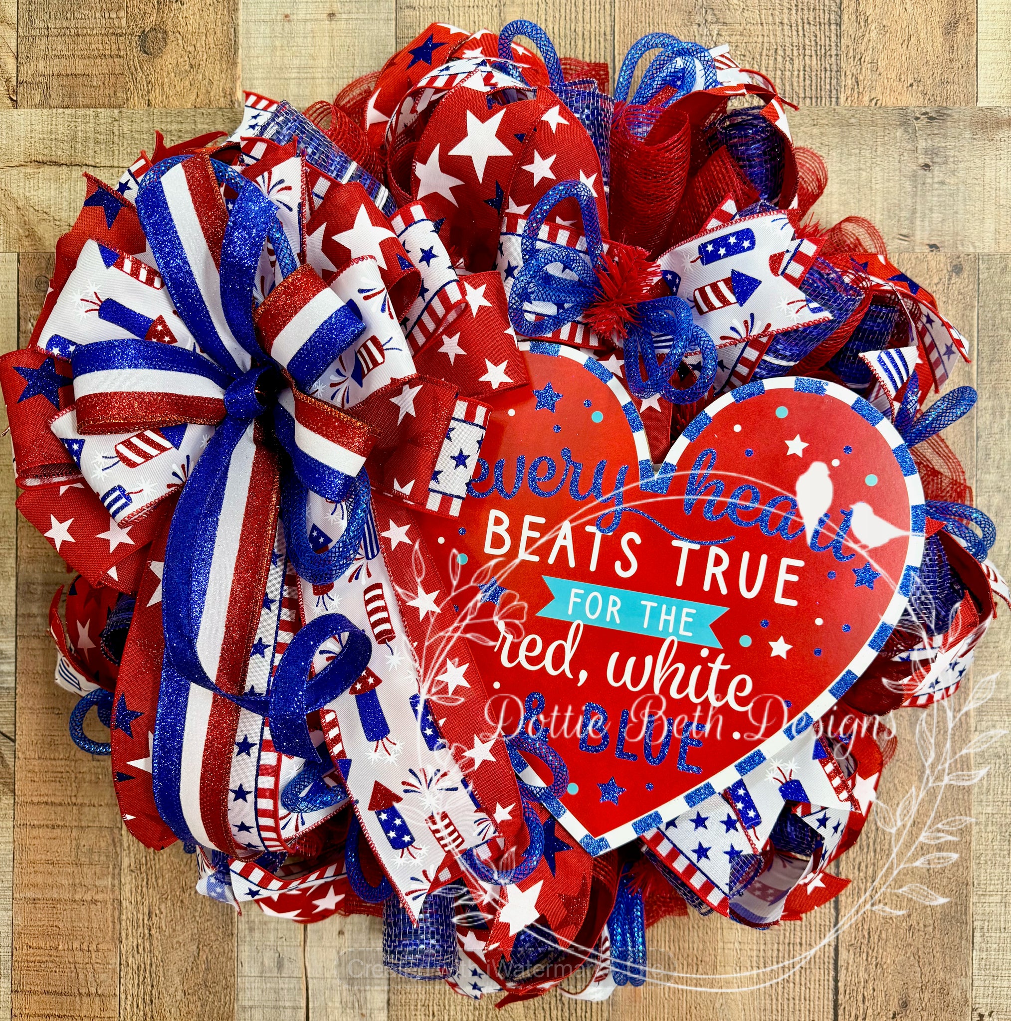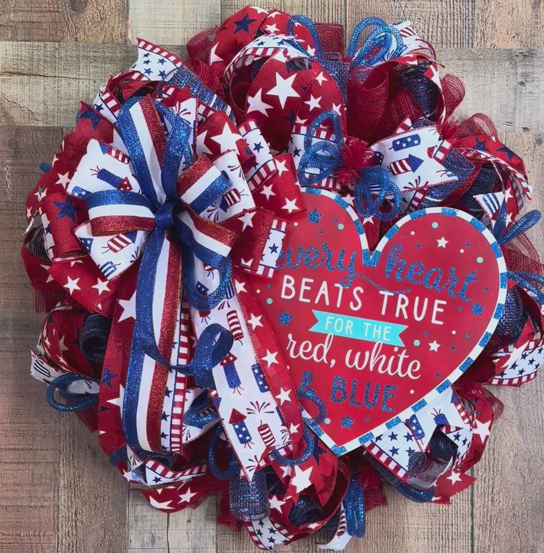 This patriotic heart wreath is all about making a statement. Designed with vibrant red deco mesh and layered with a mix of premium ribbons featuring stars, stripes, and fireworks, it’s finished with a full, eye-catching bow that brings the whole piece together beautifully.
