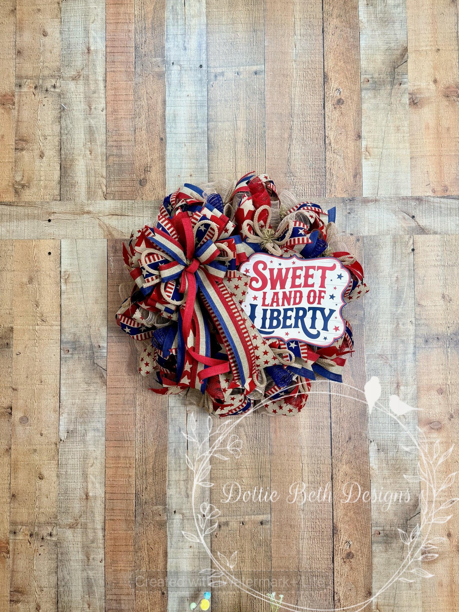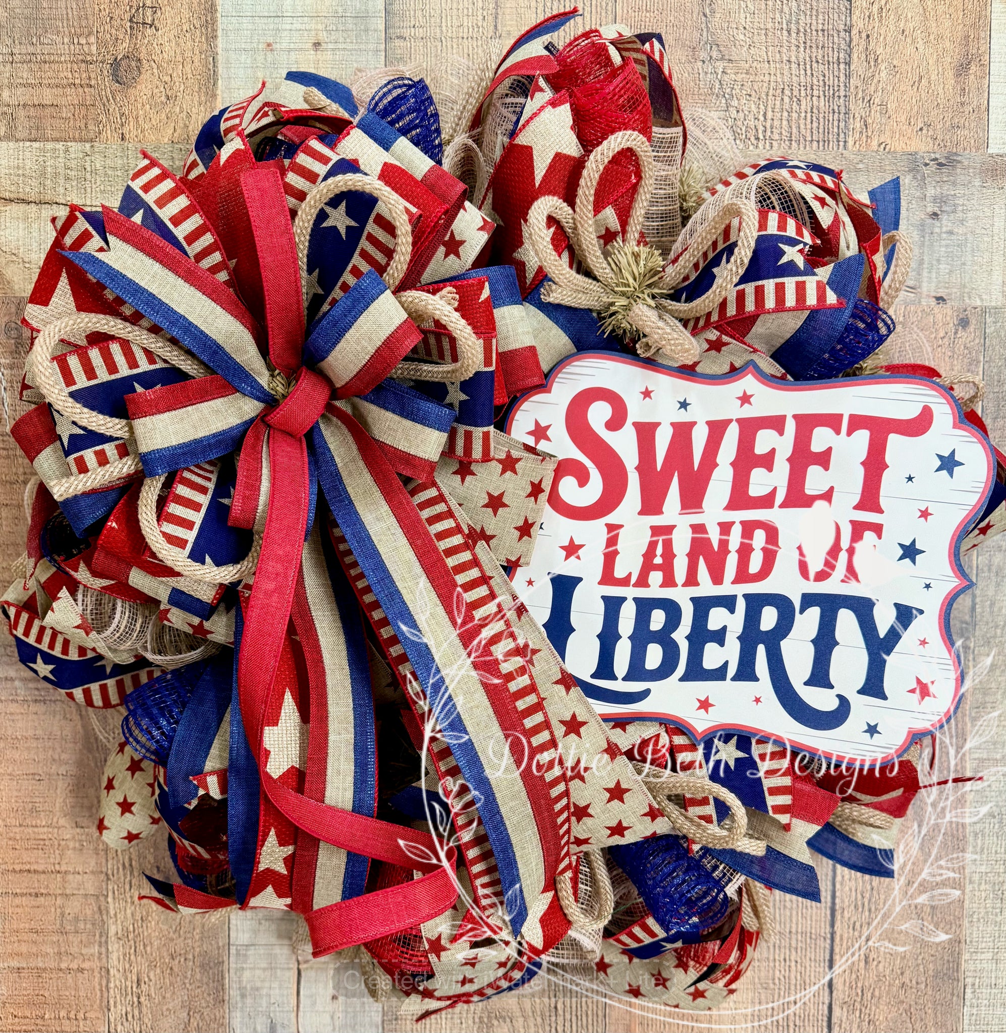 Celebrate your love of country with this bold and festive Sweet Land of Liberty patriotic wreath. This rustic red white and blue deco mesh wreath is filled with layers of premium mesh and an abundance of coordinating ribbons featuring stars, stripes, and classic Americana patterns, creating a full and eye-catching patriotic front door wreath.