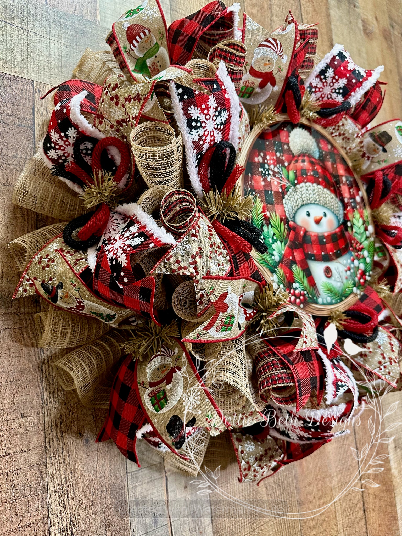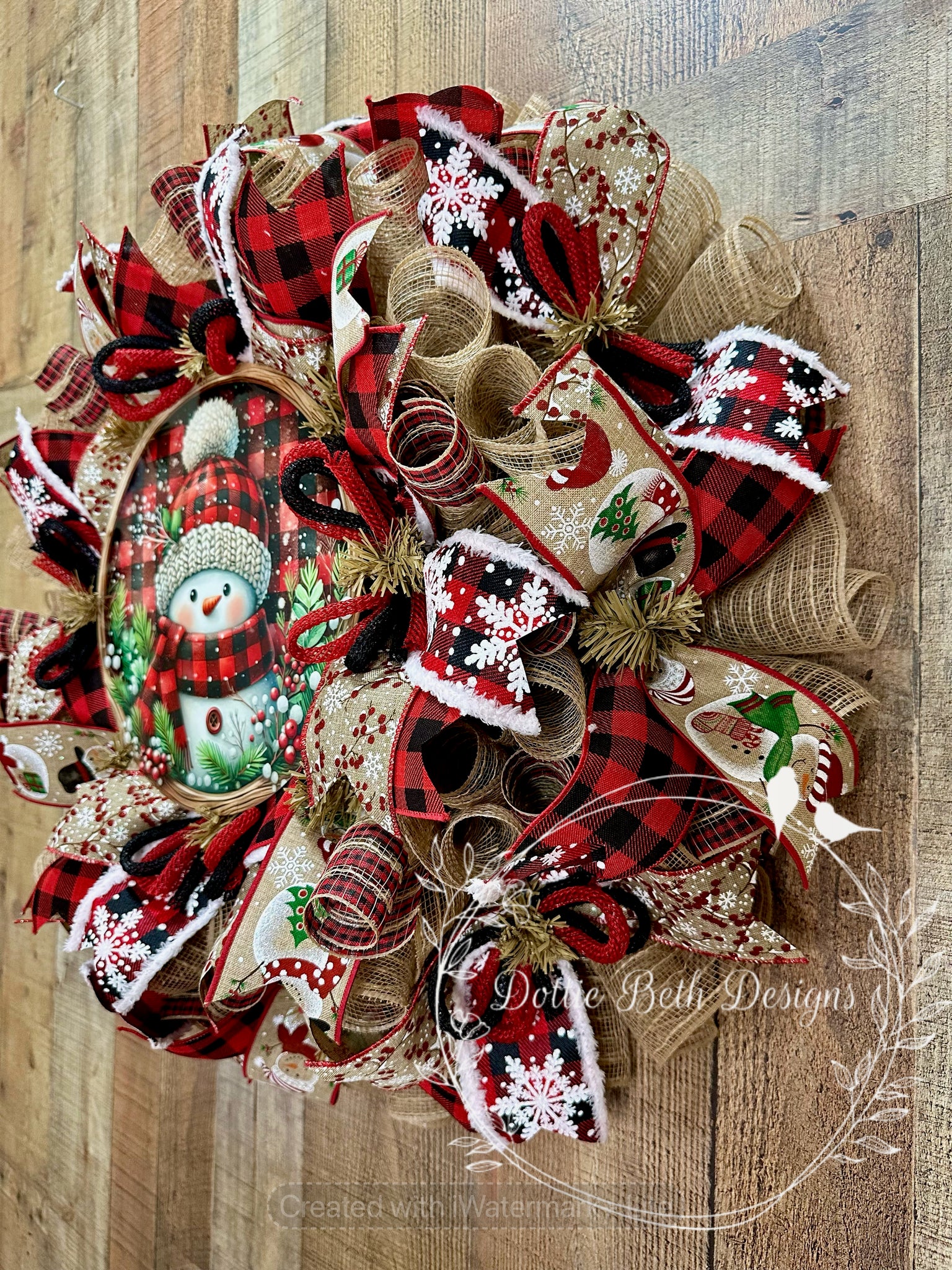 Approx 25” in diameter. Natural work wreath with natural poly jute mesh and natural and buffalo plaid stripe mesh accents. Four coordinating ribbons, metal sublimated sign and red and black jute flex tubing