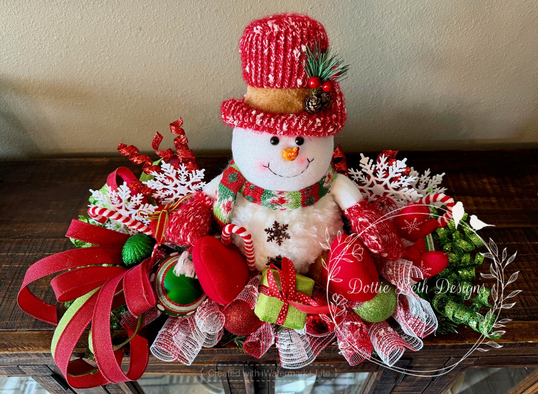 This festive Christmas centerpiece features an adorable snowman dressed in red knit mittens and a matching hat, surrounded by vibrant holiday ribbons, ornaments, snowflakes, and greenery. The cheerful red and green color palette adds the perfect pop of Christmas magic to dining tables, consoles, buffets, or entryways. Measures approximately 28 inches in length. A charming addition to classic holiday décor and a wonderful gift for anyone who loves whimsical Christmas decorating.