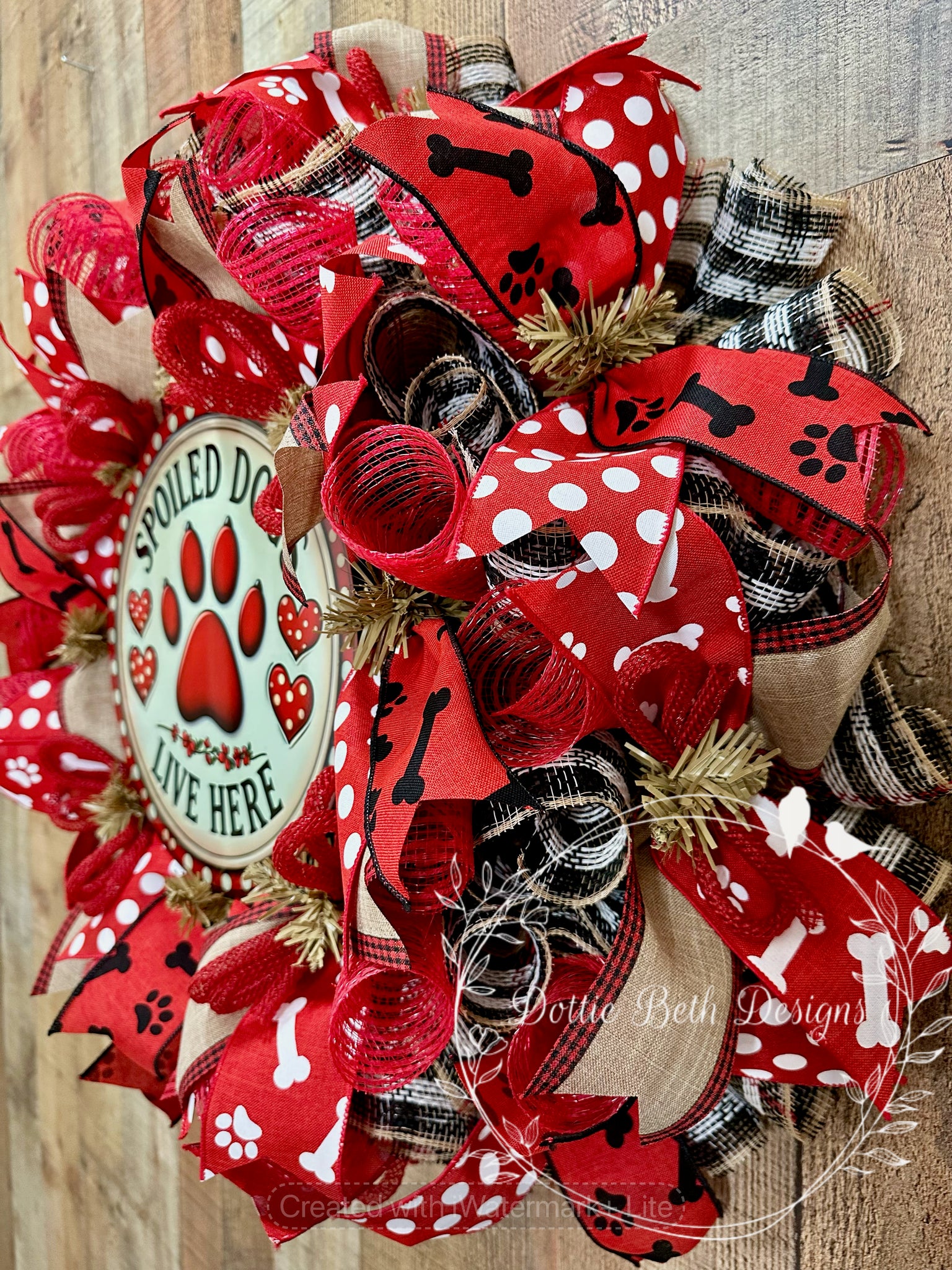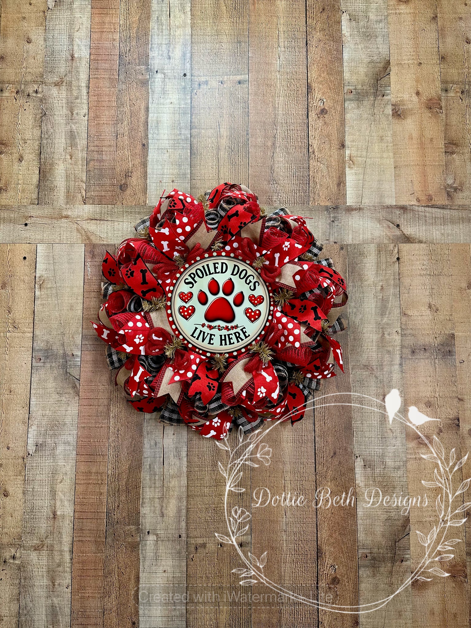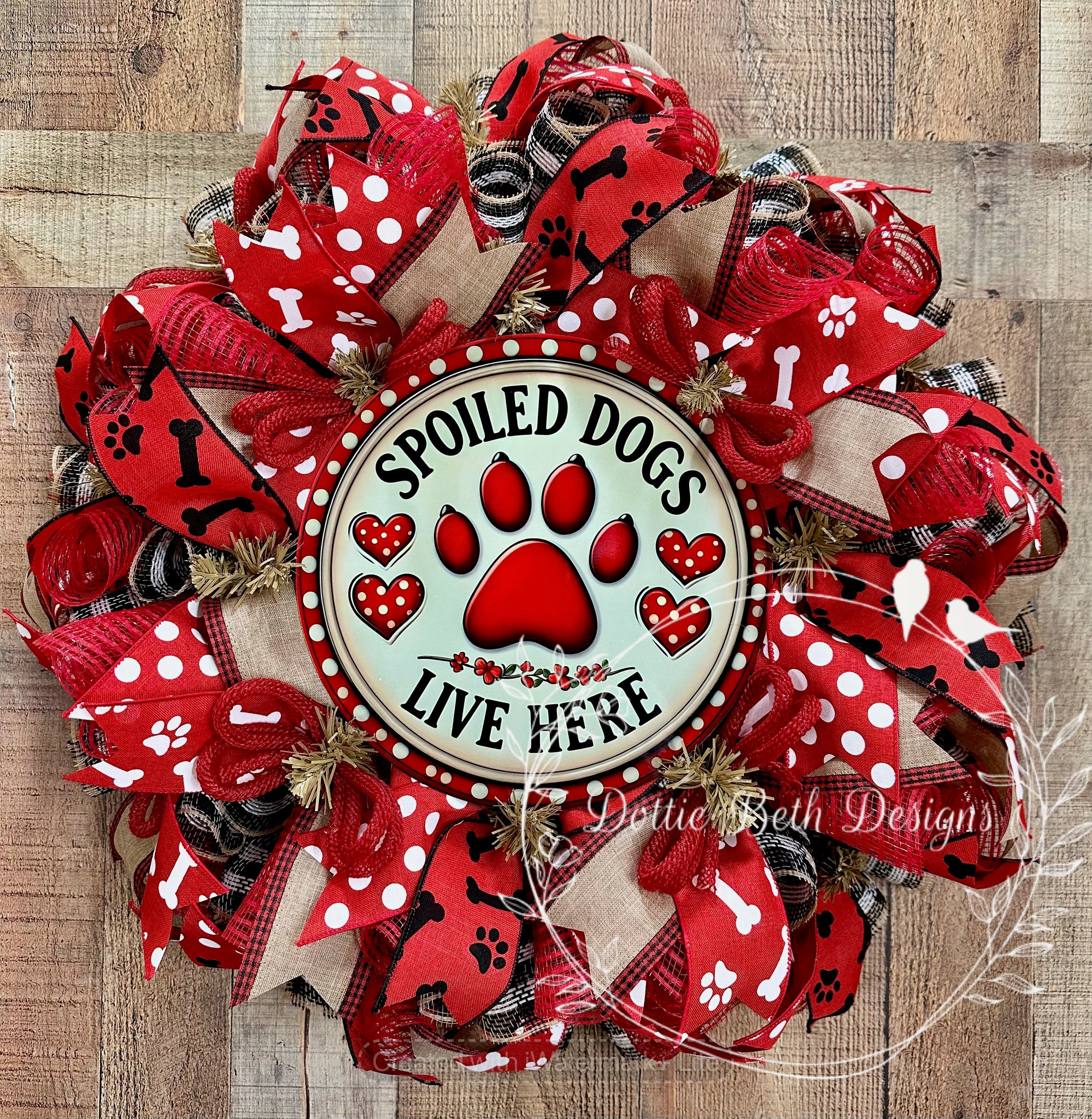Approx 25” in diameter. Natural work wreath with natural, black and red plaid poly jute deco mesh and red mesh accents. Four coordinating ribbons, metal sublimated sign and red jute flex tubing