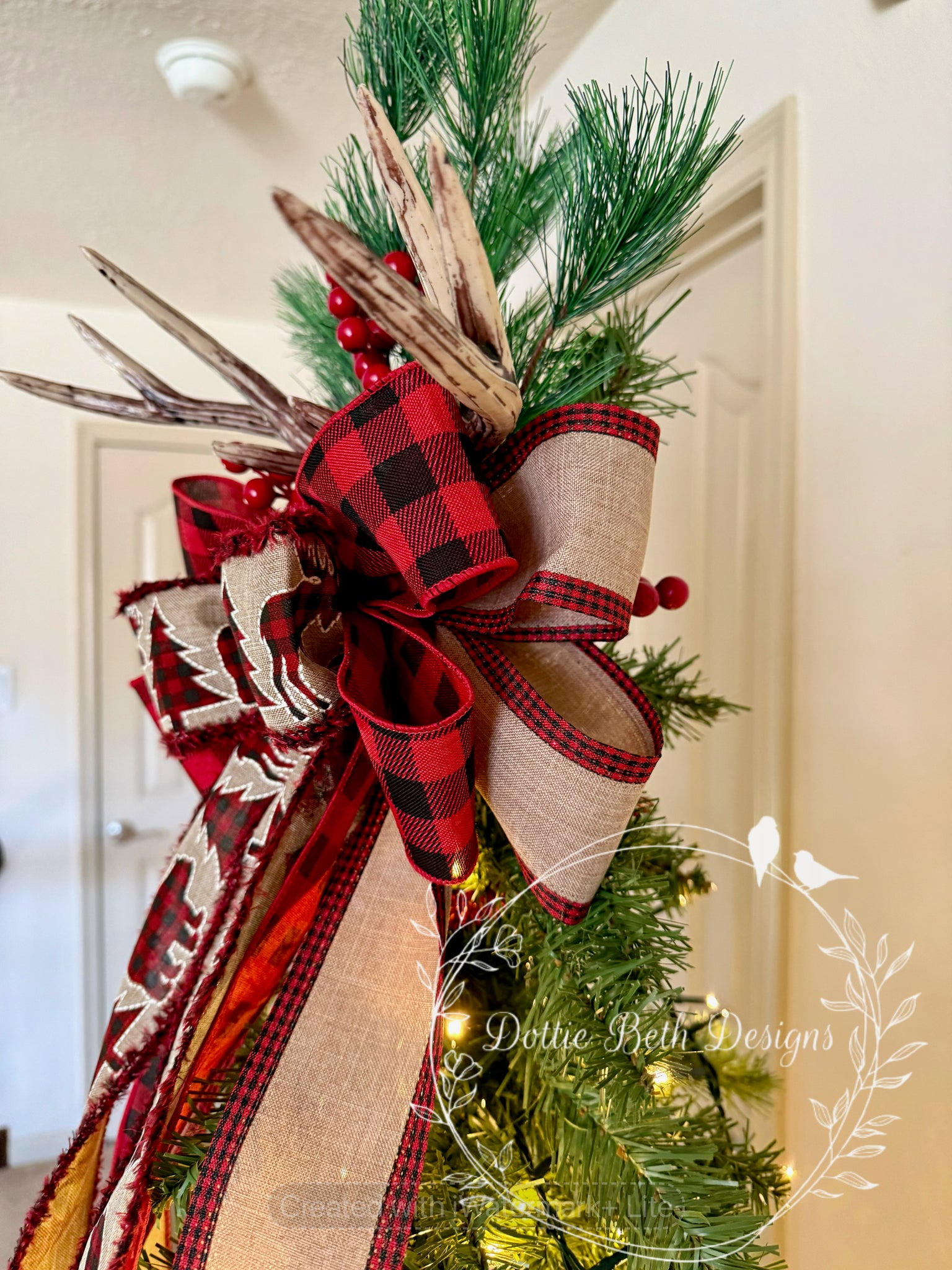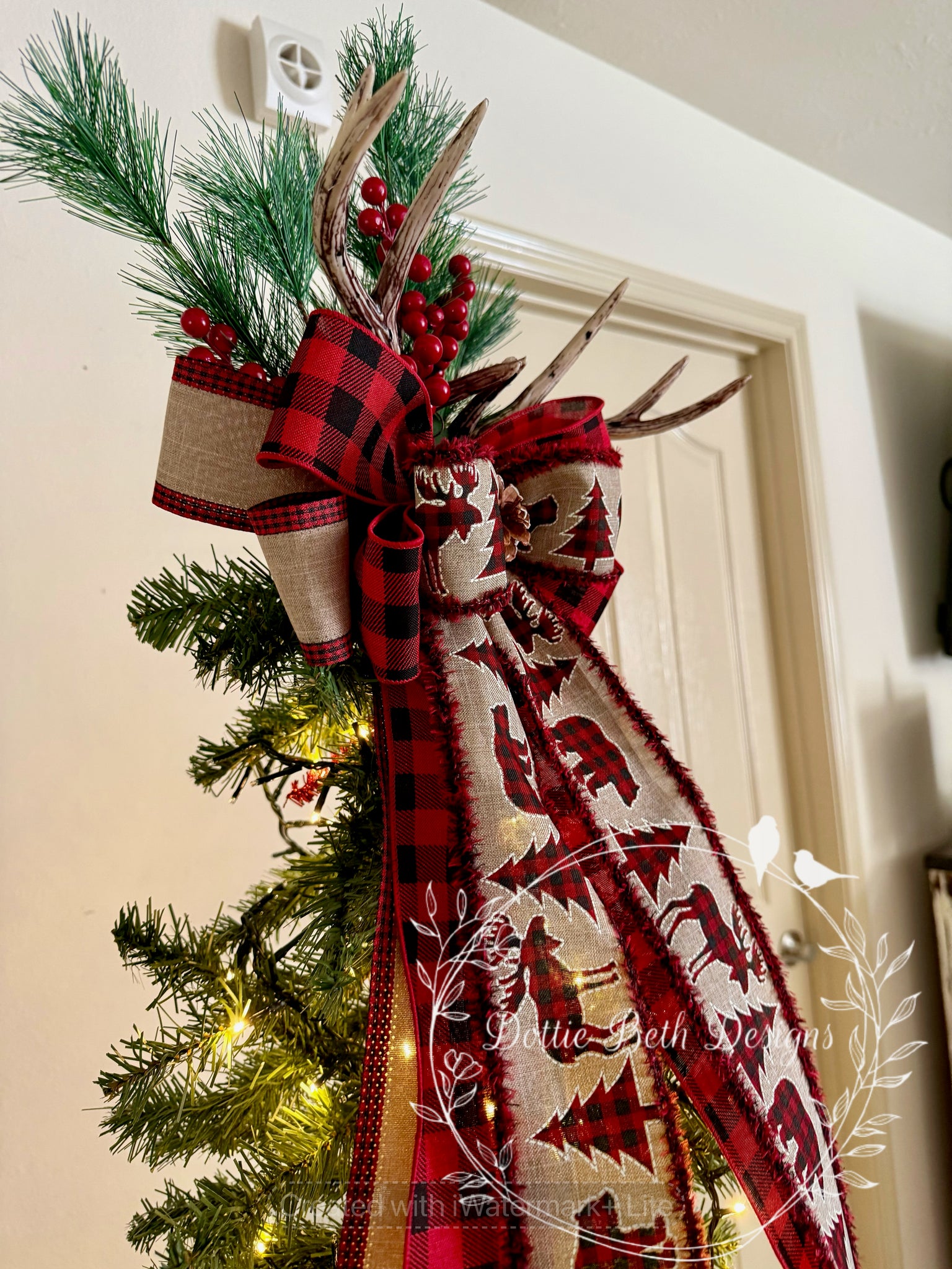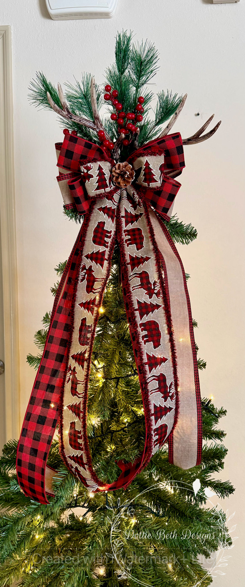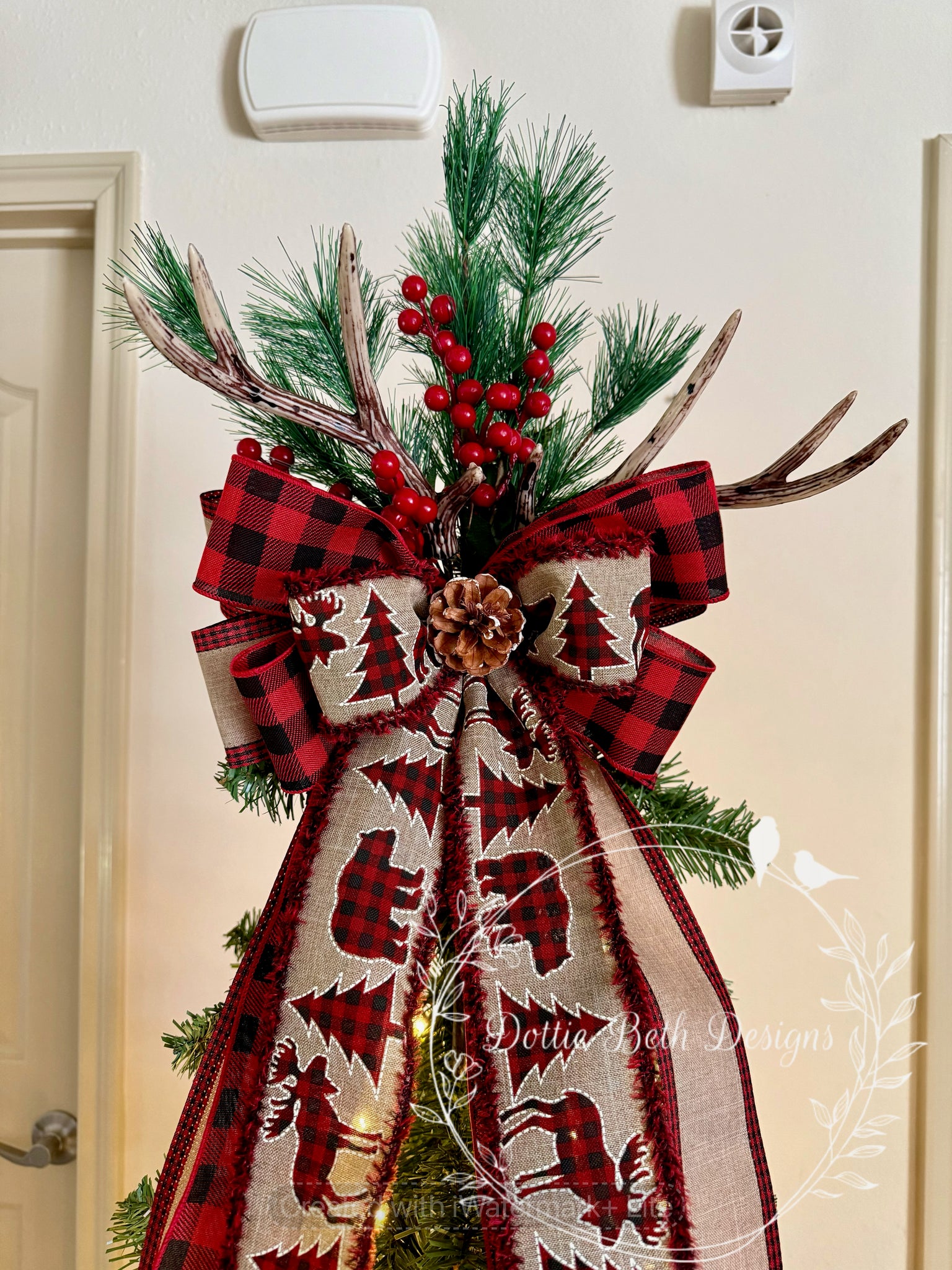 Bring rustic charm to your holiday tree with this Woodland Plaid Christmas Tree Topper. Designed with layered buffalo plaid and tree-patterned ribbons, frosted pine branches, red berries, and antler accents, this piece blends cozy cabin style with festive elegance. The natural pinecone center adds a perfect woodland touch that pairs beautifully with farmhouse or lodge-inspired décor. Crafted with high-quality wired ribbon for a full, structured bow that holds its shape all season long.